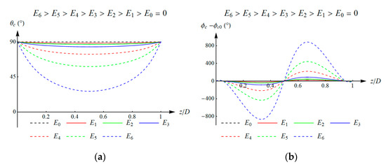 Figure 11 presents the applied distributions of the director characterized by the tilt and twist angles as functions of the coordinate z. For better clarity of the presented results, Figure 11b shows the relative deformations of the angle, i.e., ϕc–ϕc0, in relation to the angle ϕc0 obtained for the case of the undeformed director field. The presented curves correspond to different values of the amplitude E of the applied electric field, where the following relation was preserved: E6 > E5 > E4 > E3 > E2 > E1 > E0 = 0. To increase the transparency of the obtained curves representing the director field, the results were presented together with the curve obtained for the undeformed director field as a reference, i.e., for the electric field E0 = 0 (plotted by the dashed black curve). As it can be seen, the curves obtained for E1, E2, and E3 were characterized by a relatively low director field deformation, while the curves obtained for E4, E5, and E6 were characterized by a relatively large director field deformation. Therefore, the electric fields with the amplitudes E1, E2, and E3 can be regarded as low electric fields, whereas electric fields with the amplitudes E4, E5, and E6 can be regarded as high electric fields.