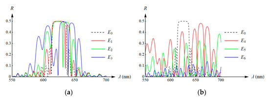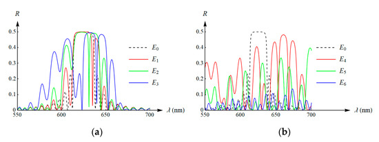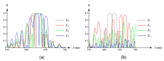 Reflection spectra of model 2 without the defect layer (d2 = 0) calculated for different values of the amplitude of the external applied electric field: (a) low electric field with the amplitudes E1, E2, and E3; (b) high electric field with the amplitudes E4, E5, and E6.