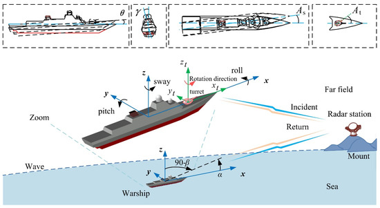 Since entering the new century, physical optics (PO) and diffraction theory have important and extensive applications in solving the radar cross-section of military targets [1,2]. The design of modern warships tends to be simple in appearance to facilitate stealth, but the electromagnetic scattering characteristics of ships will undergo complex changes if the variety of sport conditions, including the turret movement, attitude changes and the influence of the sea surface, are taken into account [2,3]. Therefore, the radar cross-section of warships under complex motion conditions has gradually gained significant interest among researchers.