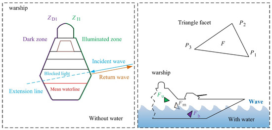 For a given warship model, the initially dark and illuminated areas are generated when illuminated by radar waves without considering seawater, as shown in Figure 2. Then, the model of the warship can be expressed as: