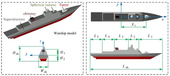 Referencing common stealth battleship designs, including the Visby Class stealth frigate and the La Fayette class frigate, a stealth warship model is built, as shown in Figure 4, where Lsh is the length of the ship, Hsh is the height of the ship, Wsh is the width of the ship, and H2 is the height from the deck to the bottom of the ship. The building on the deck is designed with an integrated inclined side wall, which facilitates the deflection of the radar wave, while the barrel and turret are designed with an inclined polyhedron. The main dimensions of this battleship are shown in Table 1 and the ship’s model is modeled using a 1:1 scale.