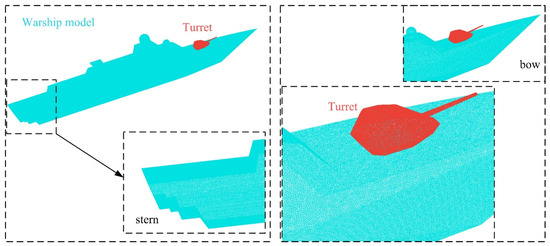 The entire surface of the warship model is meshed using high-precision unstructured grid technology as shown in Figure 5, where local mesh encryption is used to process smaller areas or parts, including the gun barrel, turret, deck edges, bow, stern and side ridges. Local mesh encryption is the use of denser grids in these local areas that require more accurate simulation. The grid size of each part of the surface of the warship is shown in Table 2.