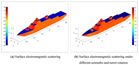 Electromagnetic scattering on the surface of the warship, RCS unit: dBm2. (a) Surface electromagnetic scattering; (b) Surface electromagnetic scattering under different azimuths and turret rotation.