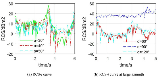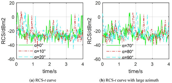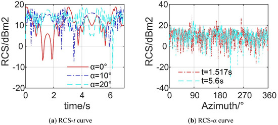 Effect of azimuth on the warship’s dynamic RCS. (a) RCS-t curve; (b) RCS-α curve.
