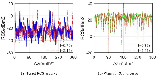 Impact of turret alone on the dynamic RCS. (a) Turret RCS-α curve; (b) Warship RCS-α curve.
