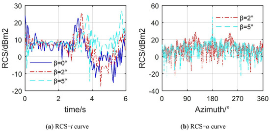 Figure 10 demonstrates that the elevation angle has a significant effect on the static and the dynamic RCS of the warship, where γ = As = At =0°, fR = 7 GHz. For Figure 10a where α = 20°, the shape of the RCS-time curve at β = 0°, 2° and 5° is similar, but the fluctuation amplitudes are different, where the peak value of the RCS-time curve at β = 0° is 24.19 dBm2 appearing at t = 0 s, that of the RCS-time curve at β = 2° is 25.49 dBm2 at t = 3.35 s, and that of the RCS-time curve at β = 5° is 26.82 dBm2 at t = 5.75 s. For Figure 10b where t = 2.7 s, the increase in the elevation angle clearly improves the lateral RCS characteristics of the warship, but it reduces the stealth characteristics of the radar in the tail direction. The increase in the elevation angle corresponds to the different radar station locations, including radar observation stations of other warships or mountains, while the increase in this angle changes the angle between the radar wave and the surface area of the warship surface lighting area, subsequently affecting the ability of these facet elements to deflect radar waves. These results show that the elevation angle is a very practical factor for the electromagnetic scattering characteristics of warships and that it cannot be ignored.