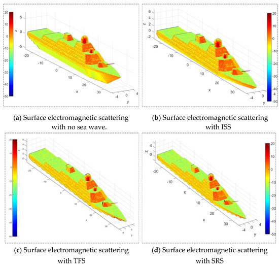 Figure 13 investigates the notion that the existence of ocean waves indeed affects the electromagnetic scattering characteristics of warship surfaces under the given observation conditions, where the following settings are made: θ(°) = −2sin t, γ(°) = 3sin t, As(°) = −1.5sin t, At(°) = 90sin t, α = 330°, β = 2°, t = 0.642 s, fR = 7 GHz, RCS unit: dBm2. When the sea wave model is not considered, all surface elements in the ZI1 area of the warship surface participate in the RCS contribution, where the azimuth is equal to 330° and the elevation angle is equal to 2°, causing most of the warship’s right and front areas to be illuminated by radar waves. Following this, a large area of deep red and red appeared on the right side of the turret, the front of the superstructure, the right front of the spherical radome and the front of the chimney. When the ideal stationary sea (ISS, as shown in Appendix A) wave model was added, where Zm = −2.1 m, xn = yn = −90 m, xm = ym = 90 m, the original ZI1 area was clearly cut out. Although there was no effect on the strong scattering area, the lighting zone changed significantly. Since there is no fluctuation in the wave model at this time, the cut in the surface electromagnetic scattering model of the warship is flat. When the trigonometric function sea (TFS, as shown in Appendix A) model is added, where Ax = 0.5, Ay = 0.2, ωx = ωy = 10, the notch of the warship electromagnetic scattering model is not flat, but changes with the waves. Since the TFS model is based on the trigonometric functions, taking into account linear variables, tiny random phases, and tiny random wave fluctuations, the edges of the cutout mainly show the undulating shape of the trigonometric function but with small irregular jitters. For the simplified regular sea (SRS, as shown in Appendix A) model, where k1 = 4, χ1 = π/3, χ0 = π/10, ω1 = Cz = 1, U = 10 m/s, it is also based on a trigonometric function, taking into account the small random wave increments, which makes the cutout very smooth overall.