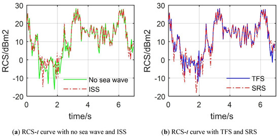 Effects of different sea wave models on the warship’s dynamic RCS. (a) RCS-t curve with no sea wave and ISS; (b) RCS-t curve with TFS and SRS.