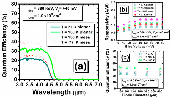 - Dehzangi, A.; Wu, D.; McClintock, R.; Li, J.; Razeghi, M. Planar nBn type-II superlattice mid-wavelength infrared photodetectors using zinc ion-implantation. Appl. Phys. Lett. 2020, 116, 221103. [Google Scholar] [CrossRef]