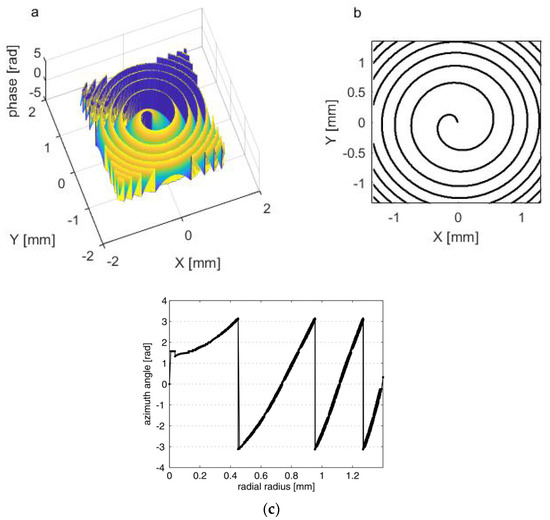 To demonstrate how the spiral equation can be found and verify the fitting procedure, we started from numerically generated phase maps. In the first step, the complex amplitude of the vortex beam is calculated using Equation (1), from which the phase term has been extracted.