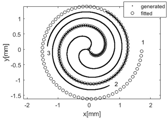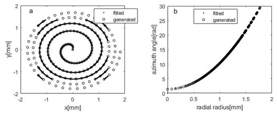 In the next step of calculations, the received points are sorted according to radial radii, and then unwrapping is necessary to assign the proper value of the azimuthal angle to the radial radius. Without unwrapping, an azimuth angle ranges from −π to π, which is not the case for the spiral coordinates (Figure 3c). Increasing the azimuth angle enables a recognition of subsequent twirls of the spiral. Now, coordinates are set in proper order in order to reconstruct a curve expressed by Equation (6). In order to determine the values of parameters α and β, we use a nonlinear least squares method without normalization [15]. The nonlinear least squares is the form of least squares analysis used to fit a set of mk observations with a model that is nonlinear in “n” unknown parameters (mk ≥ n). The basis of the method is to approximate the model by a linear one and to refine the parameters by successive iterations.
