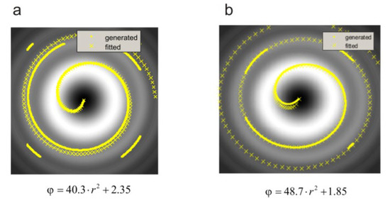 In the next paragraphs, we describe a procedure for recovering the parameters encoding Fermat’s spiral (α, β in Equation (6)), first, from numerical phase maps, and then from the phase maps obtained in the experiment.