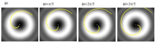 We use the algorithm described above to recover the uniform phase shift which is introduced into the vortex beam. The phase shift in the vortex beam manifests itself in the rotation of the phase profile. Figure 8 presents the spiral lines (plotted over the intensity distribution) in the case of four different values of phase ϕ0. The phase is increased subsequently by the amount of π/5, causing the rotation of the 2π jump line, and the angle by which the spiral rotates corresponds to the introduced phase shift. As mentioned earlier, the parameter β from the spiral equation describes the spiral orientation, so its value changes when the spiral rotates. Table 1 shows the results of the numerical fitting of the Fermat’s spiral parameters. One can see that α value is kept almost constant, while β changes indicate the rotation of the spiral. By calculating the difference between the β values in particular cases, we can recover the value of the introduced phase shift Δϕ, which corresponds well with the known value introduced into the beam.
