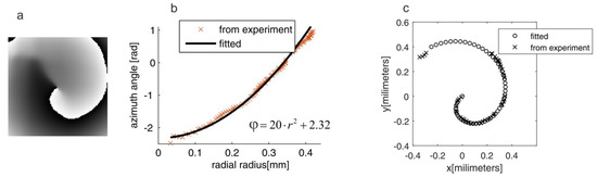 The standard Fourier technique [19] was applied to recover the phase of the object beam. To do this, the Fourier transform is applied to the detected interferogram. In its spectrum, the first order is extracted and shifted to zero order position to remove the carrier frequency. Next, the inverse Fourier transform is applied. This recovers the complex amplitude of the detected beam, in which phase distribution is coded. Figure 10a displays the exemplary phase maps of the central part of the vortex beam obtained from the experiment. Figure 10b plots the polar coordinates of the localized 2π phase jump line (points) together with the fitted line of the equation. Figure 10c compares the fitted Fermat’s spiral (circles) with the experimental points (crosses). Values of coefficients, fitted with 95% confidence bounds, are equal to and .