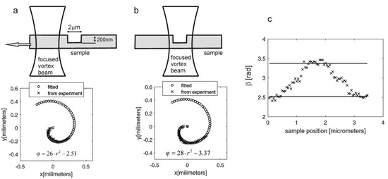 To demonstrate how this vortex beam description can be used in optical measurement, the phase sample is introduced into the object beam (at a sample plane). When the vortex beam passes through the transparent sample, its phase distribution changes. As was mentioned in the preceding section, in the case of uniform phase change within the whole beam, the phase profile rotates, manifesting the rotation of the spiral and this rotation can be read from the parameter β. In our experiment, the tiny, transparent sample had the shape of the square step of high 200 nm and size 2 μm. As the sample transverse dimensions were a little bit smaller than the vortex beam diameter and because it was hard to localize it perfectly in the beam center, it was mounted on the motorized XYZ table in order to position the sample with nanometer precision. The sample was shifted gradually with the step 0.05 μm. When the step was within the beam, the additional phase shift equal to (h is the step height equal 200 nm in our case, sample was a PMMA resist applied to the saphire substrates, n ≅ 1.48) was expected, which should cause rotation of the spiral by the amount of Δϕ, as was explained in the previous section. Figure 11 shows the idea of the experiment and obtained results. For each sample position, the interferogram was detected, phase map recovered, and parameters of Fermat’s spiral fitted (Figure 11a,b). Figure 11c shows the change of the fitted value β while the sample was moved across the beam. The reference phase value (in the case where the step was outside the beam) was calculated for a sequence of measurements and equaled 2.51 ± 0.15 rad (uncertainty was evaluated on the base of the series of measurements taken when the object was outside the vortex beam). While the phase object was gradually moved through the vortex beam, the spiral was rotated and β reached the mean value 3.37 ± 0.15 rad when the whole phase step was inside the beam. Therefore, the spiral rotated by an angle of 0.86 ± 0.15 rad, which corresponded well with the value expected from object geometry.