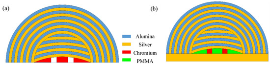Considering the conditions of bioimaging, we employ two kinds of objects here, as shown in Figure 2. The first kind of object is filled into the cavity of hyperlens, as shown in Figure 2a. Two sub-wavelength slits in chromium are employed as objects and both slits have 20 nm width. The innermost silver and alumina layer need to be employed as an object layer. The center-to-center distance between the two slits is changed to explore the imaging resolution limits of our hyperlens. When we employ hyperlens for bioimaging applications, specimens that need to be imaged are not as stable as the objects mentioned above. This means that practical imaging conditions are quite different with the above-mentioned objects. Thus, new objects need to be employed and considered in order to make our calculation conditions similar to the real bioimaging experiments. Two chromium cuboids are employed as objects, as shown in Figure 2b. The cross section of these cuboids has 30 nm width. In order to realize free objects imaging, a silver layer is employed to form a plasmonic resonant cavity with the innermost space of our hyperlens. Polymethyl methacrylate (PMMA) is filled into the rest area of the plasmonic resonant cavity. This plasmonic resonant cavity enhanced hyperlens can be used to achieve phase contrast imaging, which has higher image contrast than a conventional hyperlens [20].