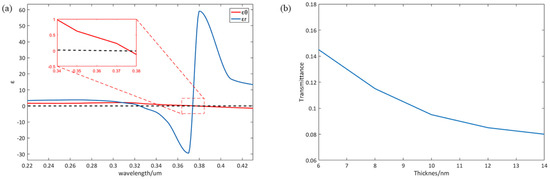 COMSOL Multiphysics was used to simulate the imaging results of this device. We employed a 2D model to illustrate the cross section of our hyperlens. Scattering boundary conditions with nonincident field were used and physics-controlled meshes with ultra-fine size were employed. Different wavelengths and geometric parameters have been considered. Figure 3a shows curves of and when the wavelength changes. Red and blue curves represent and , respectively. The wavelength of 365 nm shows a great negative value of and a relatively large positive value of . When the wavelength is below 365 nm, a sharply increased and slowly increased will cause a worse performance of the hyperlens. Figure 3b shows how the transmission is influenced by thickness of each layer of hyperlens. Transmission decreases when the thickness is increased, but a smaller thickness also causes a decreasing resolution.