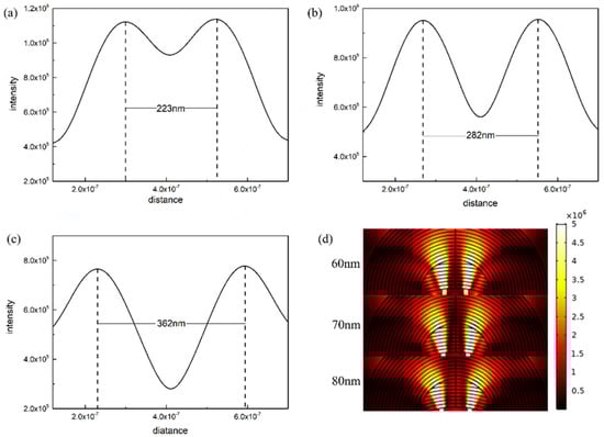 (a), (b) and (c) Electric field intensity distribution with 100 nm distance above the hyperlens expressed by line graphs. The center-to-center distance between slits is 60 nm (a), 70 nm (b), and 80 nm (c), respectively. (d) Electric field intensity distribution in the hyperlens with different center-to-center distances between the objects.