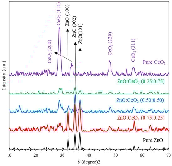 Figure 1 shows the XRD patterns of pure ZnO, pure CeO2 and ZnO:CeO2 mixed oxide thin films annealed at 500 °C for 2 h. Pure ZnO thin films exhibit peaks at Bragg’s angles of 32.13°, 34.75° and 36.58° corresponding to (100), (002) and (101) crystallographic planes, respectively. In addition, XRD patterns confirm that ZnO thin film is polycrystalline and exhibits wurtzite hexagonal structure [3,43]. In addition, the main peaks of pure CeO2 thin film are observed at Bragg’s angles of 28.89°, 33.54° and 47.88° corresponding to CeO2 crystallographic planes indexed by Miller indices of (111), (200) and (220), respectively. Comparison of observed and standard ‘’ () planes as matched with JCPDS cards no. 034–394 indicates that CeO2 thin film is polycrystalline and exhibit cubic phase with fluorite structure [44]. Furthermore, XRD patterns indicate that pure CeO2 and ZnO thin films have a higher degree of crystallinity than that of ZnO:CeO2 mixed thin films. Careful examination of XRD patterns reveal that ZnO:CeO2 mixed thin films encompass distinct crystalline phases of ZnO and CeO2 components [45]. XRD patterns of ZnO:CeO2 mixed thin films containing 25%–75% of CeO2 NPs reveal that the intensity of ZnO reflections at (100), (002) and (101) decrease quite rapidly while that of the CeO2 (111) peak increases. This could be understood in terms of the amount of scattered X-ray from Ce4+ and Zn2+ ions. The diffraction factor f of Ce4+ ions is higher than that of Zn2+ ions. Since f of an atom depends mainly on where is the scattering angle and is the wavelength of X-ray and atomic number Z, it is challenging to identify lighter atoms in presence of heavier atoms. The diffraction pattern of ZnO is much weaker than that of CeO2 [44]. Obviously, the individual peak positions of CeO2 and ZnO remain unchanged in the XRD pattern of ZnO:CeO2 composite oxides. This provides substantial evidence that XRD pattern of ZnO:CeO2 consists mainly of distinct phases of ceria and ZnO. The existence of weaker peaks indicates that dissolving of small amount of ZnO in ceria and vice versa is possible for a certain extent. Mixing ZnO hexagonal lattice with CeO2 fluorite leads to a drastic change of diffraction pattern. Thus, lattice constant of the composite changes significantly. The lattice constant ‘’ for the cubic phase structure and ‘’ for the hexagonal phase structure are evaluated as: