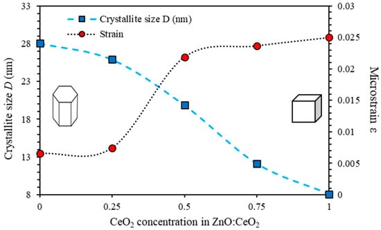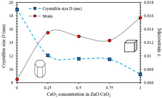To elucidate the elastic properties of synthesized mixed oxide thin films, crystallite size and microstrain originated from the lattice misfitting and mismatching are deduced from the peak width and the shift of the 2θ peak position [47]. Fundamentally, average can be computed from the Debye Scherrer’s formula, [48,49] where is the wavelength of the X-ray (), (in radians) is the full width at half maximum (FWHM), is Bragg’s angle and = 0.94 is the Scherrer constant [50,51]. The average microstrain [48,52]. The estimated values of and of ZnO:CeO2 mixed oxide thin films are plotted as functions of CeO2 concentrations as shown in Figure 2. The value of D of pure ZnO and CeO2 thin films was found to be 18.93 nm and 9.26 nm, respectively. However, D of ZnO:CeO2 mixed oxide thin films containing 25%, 50% and 75% of CeO2 were found to be 12.09 nm, 11.58 nm and 11.50 nm, respectively. Obviously, Figure 2 shows an inverse relationship between and D which could be attributed to the decrease in the volume occupied by constituents inside the combined crystalline structure. In addition, as the volume of the unit cells increases, the total surface area is increased causing a shift in planes positions [53].