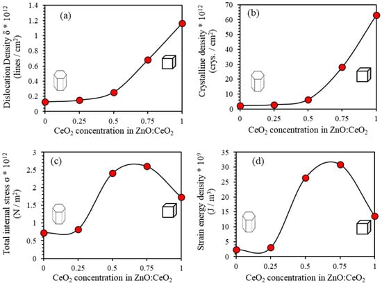 To obtain a deeper insight into crystal defects, we investigate the dislocations that may be caused by internal stresses in the sub-lattices. Dislocations are formed at the boundaries between the glided and the un-slipped regions of the strained structure. The number per unit volume and the strength of dislocations determine the strength and ductility of materials. [58]. We calculate the density of dislocations (δ) by using the line profile analysis of XRD (LPA-XRD) patterns and using simple Williamson-Smallman formula given by , where is the crystallite size calculated using Williamsons Hall equation [48,58,59,60,61]. Figure 4a shows the dislocation density of the ZnO:CeO2 mixed oxides thin films as a function of CeO2 concentration. The value of of pure ZnO thin film is found to be lines/cm2 and that of pure CeO2 thin film is lines/cm2. The values of of ZnO:CeO2 mixed oxide thin films containing 25%, 50% and 75% of CeO2 are calculated to be and lines/cm2, respectively. The value of (δ) measures the agglomerations of crystalline clusters. The increasing (δ) with increasing the concentration of CeO2 in the mixed-oxide composite implies a decreasing of the crystallization and significant increasing of vacancies [58,60]. The increasing in dislocation density can be attributed to the internal strain during film formation in addition to the partial interstitial substitution of the Ce4+ ion instead of Zn2+.