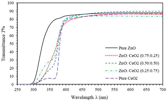 Transmittance spectra of pure ZnO, pure CeO2 and ZnO:CeO2 mixed oxides thin films are displayed in Figure 5. Transmittance spectra of pure ZnO thin film show steep rising from about 0% up to 88% as wavelength increases from 300–350 nm. It maintains almost constant value for the 350–700 nm spectral range. Moreover, the transmittance spectra of pure CeO2 thin film demonstrate fast increasing trend about 0% up to 86% for the 300–420 nm spectral range. Similarly, it attains a constant value for 420–700 nm range. As can be clearly seen from Figure 5, transmittance of ZnO:CeO2 mixed oxides thin films have the same behavior of pure CeO2 thin film. However, it exhibits different transmittance values in 420–700 nm range. Interestingly, absorption edge is shifted towards the red region (lower energy) as CeO2 concentration in ZnO:CeO2 mixed oxides thin films is increased. Consequently, a considerable decrease in band gap energy is observed. To elucidate the significant reduction in the optical and gap energy, several factors are identified to contribute to this reduction. Among these is the fact that CeO2 thin films have lower band gap energy than ZnO thin films. In addition, enhanced fs-p interactions between the band electrons of ZnO:CeO2 mixed oxides and the localized fs electrons of cerium and the strong mismatch between the electronegativities of Ce and Zn in the ZnO: CeO2 mixed oxide system contribute significantly [65,66,67,68]. Small shoulders in transmittance spectra CeO2 and ZnO:CeO2 mixed oxides thin films appear at a wavelength of ~350 confirming the excitonic absorption characteristics of those thin films [69].