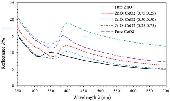 Reflectance spectra are shown in Figure 6. The reflectance values of pure ZnO and pure CeO2 thin film are found to be ranging from 5%–10% and 7%–15% as the wavelength decreases from 700 nm to 400 nm, respectively. Reflectance spectra of ZnO:CeO2 mixed oxides thin films demonstrate a tuning of as the concentration of CeO2 in ZnO:CeO2 mixed oxides is increased. This can be attributed to the changes in crystalline size and microstrain of ZnO:CeO2 mixed oxides crystals. In addition, ZnO:CeO2 mixed oxides thin films exhibit absorb photons of wavelength ranging between 280 nm to 330 nm efficiently. Consequently, incorporation of ZnO with CeO2 enhance UV–filter efficiency of thin films especially for UVB and UVC irradiation. Overall, ZnO:CeO2 mixed oxides thin films could be potential candidates for high transparency and UV-filter applications.