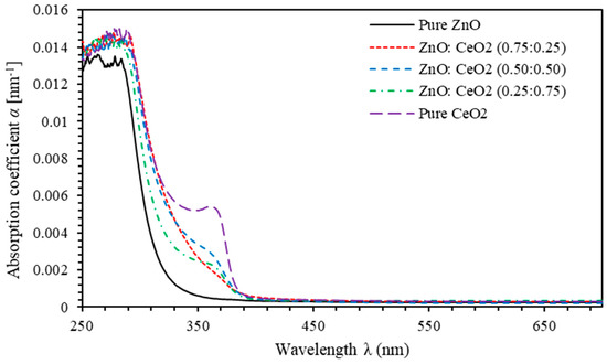 Absorption coefficient ( describes the intensity attenuation of the electromagnetic waves passing through a thin film [70]. The parameter can be expressed using the corrected transmission (), as [2,71,72], where is the thickness of thin films measured using SEM micrograph and estimated to be 500 nm. Figure 7 shows the variation of of pure ZnO, pure CeO2 and ZnO:CeO2 mixed oxides thin films with the incident photon wavelength. Obviously, exhibits higher values just before the absorption edge compared with those after the absorption edge. This can be attributed to the resonance of the frequency of incident photons with that of electronic polarizability. The dramatic reduction of at the absorption edge could be explained in terms of the coupling occur between electrons of the constituents [73,74,75,76]. Furthermore, the red shift of absorption edge upon the introduction of CeO2 into ZnO:CeO2 mixed oxides thin films is due to the change in the width of localized states and consequent changes in the energy gap.