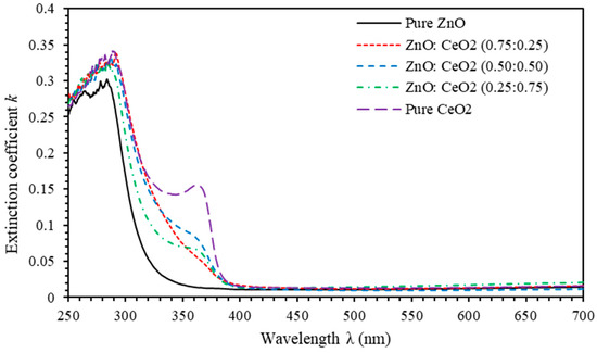 To elucidate the attenuation of electromagnetic waves by the proposed thin films in this work, we calculate the extinction coefficient . It is related to the absorption coefficient, [2]. Figure 8 shows of pure ZnO, pure CeO2 and ZnO:CeO2 mixed oxides thin films as a function of incident photon wavelength. A drastic decrease of k is noticed prior to the absorption edge indicating that thin films allow electromagnetic waves to pass through without any decay or damping for . Moreover, k exhibits an increasing trend as the concentration of CeO2 introduced in ZnO:CeO2 mixed oxides thin films is increased. Therefore, ZnO:CeO2 mixed oxides thin films have a larger ability to attenuate incident light by scattering and absorption.