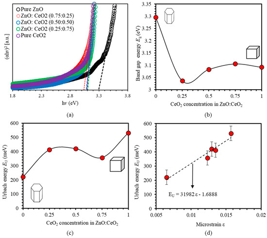 (a) Tauc plot of pure ZnO, pure CeO2 and ZnO:CeO2 mixed oxides thin films, (b) Band gap energies () of ZnO:CeO2 mixed oxides thin films as a function of CeO2 concentrations, (c) Urbach energy () of pure ZnO, pure CeO2 and ZnO:CeO2 mixed oxides thin films and (d) Plot of the relationship between Urbach energy EU and microstrain ε of ZnO:CeO2 mixed oxides thin films.