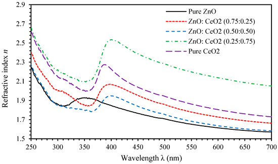Refractive index, , of a thin film is closely related to electronic polarization of ions and the local electric and lattice fields [78,79]. The parameter can be expressed as [2]. Figure 10 shows of pure ZnO, pure CeO2 and ZnO:CeO2 mixed oxides thin films as a function of the wavelength of incident light. Obviously, spectral behavior of n can be divided into two regions. For () called anomalous dispersion region, the frequency of incident photon resonates with plasma frequency leading to strong electron coupling to the oscillating electric field [80]. For (normal dispersion region), n decreases continuously with increasing wavelength and shows significant normal dispersion. We found that n of ZnO and CeO2 thin films exhibits values ranging between 1.57 and 1.85 and 1.73 and 2.25 as the wavelength decreases from 700 nm to 400 nm, respectively. We found that increasing the concentration of CeO2 in ZnO:CeO2 mixed oxides thin films leads to considerable change of n values. This can be attributed to the changes induced in crystalline size and microstrain of ZnO:CeO2 mixed oxides crystals that leads to change in surface morphology and vacancies inside the crystal structure. High refractive index materials can be used in many optoelectronic applications such as enhancing the visual properties of electronic displays, which includes LCDs, OLEDs, and quantum dot (QDLED) televisions [81,82].
