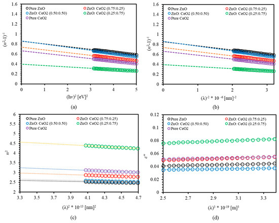 Therefore, plotting versus yields the values of the dispersion parameters via fitting the linear relation. Figure 11a shows versus for pure ZnO, pure CeO2 and ZnO:CeO2 mixed oxides thin films. The estimated values of and are presented in Table 2. The value of of pure ZnO and pure CeO2 thin films are found to be 3.959 eV and 3.603, respectively. The values of for ZnO:CeO2 mixed oxides thin films are found to be intermediate between those of pure ZnO and pure CeO2 thin films. Introducing CeO2 in ZnO:CeO2 mixed oxides thin films leads to a decrease in the energy of bonding and a change in the iconicity of these bonds in the nanocomposite. Consequently a decrease in the value of [76]. Moreover, the dispersion energy increases upon introducing CeO2 in ZnO:CeO2 mixed oxides. This increase could be attributed to the fact that cubic structure has higher dispersion energy than hexagonal structure. The values of and are used to estimate the zero-frequency dielectric constant and the zero-frequency refractive index by rewriting Equation (8) and setting leading to