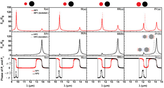 Note that additional resonant peaks in field enhancement spectra are due to the particle–particle interaction, however they arise from different origins. We plot the phase spectra for NP1 and NP2 in Figure 2. Dipole moments of NP1 and NP2 are in-phase in resonant peak at long wavelength (, see Figure 2IV(c)), so that the peak for both particles are dramatically enhanced when the particle–particle interaction becomes strong. In this case, not only NP1 but also NP2 benefit from the particle–particle coupling. On the other hand, NP1 and NP2 are out-of-phase at a short wavelength (see Figure 2IV(c)), hence field enhancement is eliminated for NP1 and additional resonant peak in NP2 shows less dominating. These “in-phase” and “out-of-phase” coupling modes result from the so-called cascaded plasmon resonances [34,35] in adjacent nanoparticles with different radii, as indicated schematically in the inset in Figure 2IV(b). Alternately, they are relevant to “bonding” and “anti-bonding” modes due to the different coupling symmetry of charge distributed around two adjacent particles. Similar to the plasmon hybridization of metallic shell [19], we introduce the hybridization theory to explain the two resonant modes in the cascaded dimer, of which schematic diagram is shown in Figure 3. Besides that, the sharp anti-bonding mode interferes with the relatively broadband bonding mode thus leads to a well-pronounced asymmetric sharp line profile–Fano resonant profile in the internal field enhancement spectra for NP2 (see the middle panels in Figure 2). Additionally, the Fano curve becomes obvious as the coupling strength grows. However, no Fano profile exists in NP1’s internal field enhancement spectra. This kind of Fano profile is different from the coupling of optical excitations existing in different materials, for instance, a silver-gold heterogeneous dimer, whose Fano profile is arising from the coupling of localized surface plasmon resonance of silver component and the continuum of interband transitions of the gold one [36,37,38,39]. To further illustrate, we start next with the mathematical analysis.