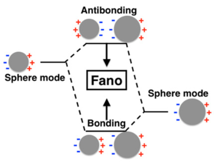 The schematic diagram of the plasmon hybridization in the cascaded graphene-coated dimer. The Fano resonance arises due to the interference between antibonding and bonding modes.