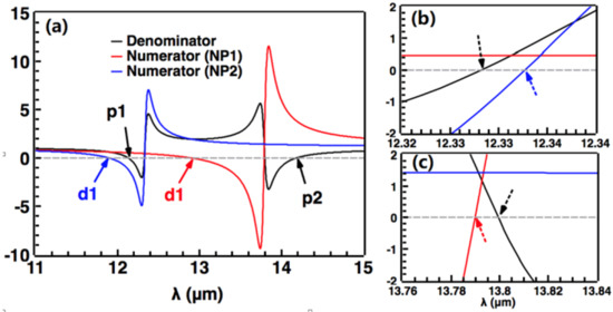 (a) Calculated results of denominator term (black) and numerator terms (red for NP1 and blue for NP2) in the function of incident wavelength. (b,c) are the local enlarged images cut from (a), located around and , respectively. The physical parameters used in the calculation are the same as in Figure 2IV.