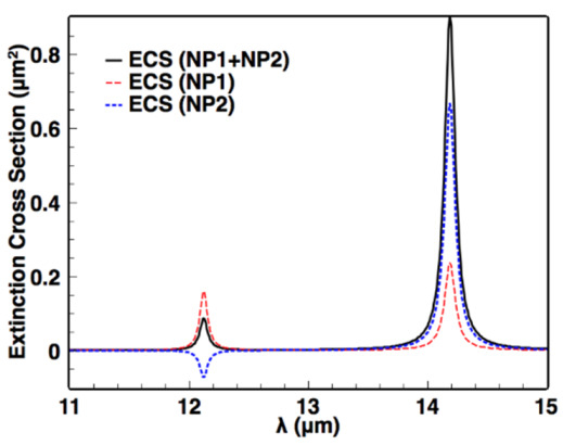 The sharp anti-bonding mode interferes with the relatively broadband bonding mode, thus leading to a sharp Fano resonant profile in internal field enhancement spectra for NP2 (see the middle panels in Figure 2). Additionally, the Fano curve becomes obvious as the coupling strength grows. However, this intrinsic Fano resonance existing in near field might be hidden in the curve of the far field spectrum. To demonstrate, we plot the extinction cross-section spectrum (ECS) in Figure 6 according to the general expression for the extinction cross-sections of adjacent particles with dipole moments and incident field as follow in Equation (11). As Equation (11) contains two separated terms corresponding to NP1 and NP2, respectively, which indicate different contributions of adjacent dimer to the total ECS, we separate the two different contributions accordingly in Figure 6. It is clearly shown that the ECS curves are typically symmetric line shape for both total and separate contributions. The opposite sign of separate ECS in the antibonding resonance demonstrates the different contributions of the adjacent dimer to the total ECS especially for NP2. The negative value of ECS means the enhanced forward light passing by the particle along the incident direction, which is abnormal for a lossy particle. The particle–particle interaction in the adjacent dimer leads to the enhanced forward light for NP2 (with negative ECS value ) but more extinct forward light for NP1 (with positive ECS value ) so that the total ECS still keeps positive.