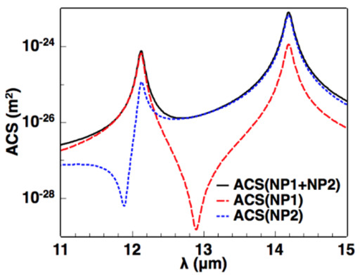 The situation is similar in the total absorption cross-section as shown in Figure 7. The total absorption cross-section (ACS) for the dimer is defined in Equation (12). Contrary to the total ACS, the separate contributions of NP1 and NP2 show asymmetric Fano profiles in the ACS curves around anti bonding position, respectively. Unlike the separate contributions in the ECS, the separate terms in Equation (12) are more relative to the dipole moments itself, so that the line shape is similar to the internal field showing the Fano profile.