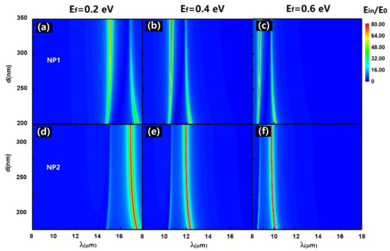Internal field enhancement as the functions of center-to-center distance and incident wavelength in NP1 (Upper panel) and NP2 (lower panel) with different Fermi energy levels: (a,d) , (b,e) , and (c,f) , respectively. The radius of NP1 is and other parameters are the same as used in Figure 2.