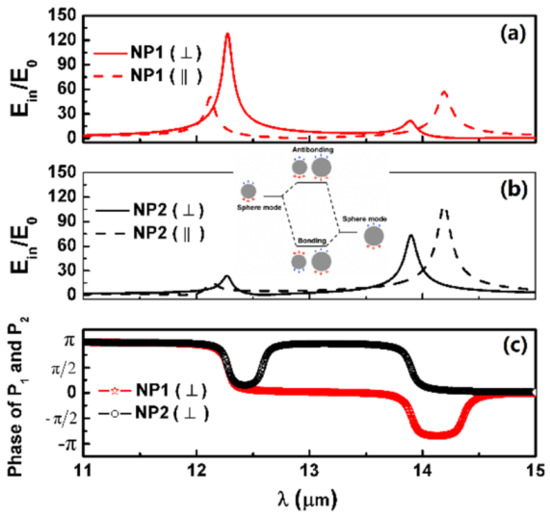 Up to now, we analyze the near field enhancement and far field properties of adjacent graphene dimer under linearly polarized light illumination with the polarization direction parallel to the dimer axis. In this case, “out-of-phase” anti-bonding and “in-phase” bonding modes are excited according to the plasmon hybridization model. Note that such a plasmonic dimer structure shall generally predict four plasmon hybridization formations within the dipole approximation [18,40,41], which corresponds to different orientation of exciting incident polarization. If the polarization direction is perpendicular to the dimer axis, paralleled dipole moments of NP1 and NP2 exhibit “in-phase” anti-bonding mode and “out-of-phase” bonding mode. Additionally, the “in-phase” anti-bonding mode has higher energy than the “out-of-phase” bonding one, as shown in Figure 10. Although the coupling strength of plasmon hybridization in this situation is weaker, the Fano profile in the near field enhancement still exists.