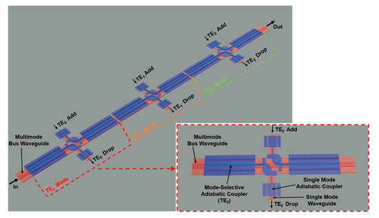 The following are available online at https://www.mdpi.com/2304-6732/7/4/80/s1, Figure S1: Mode overlap integral result of the lateral offset versus gap spacings for TE1 mode coupler, Figure S2: Mode overlap integral results of the initial and final widths of the tapered waveguide for the TE1 mode coupler. (a) Overlap integral between the TE1 mode of the bus waveguide and the TE0 mode of the coupler waveguide for the initial width of the tapered coupler. (b) Overlap integral between the TE2 mode of the bus waveguide and the TE0 mode of the coupler waveguide for the initial width of the tapered coupler. (c) Overlap integral between the TE1 mode of the bus waveguide and the TE0 mode of the coupler waveguide for the final width of the tapered coupler. (d) Overlap integral between the TE2 mode of the bus waveguide and the TE0 mode of the coupler waveguide for the final width of the tapered coupler. The white lines show the boundaries of overlap integrals of 0.05, Figure S3: Mode overlap integral results of the initial and final widths of the tapered waveguide for the TE2 mode coupler. (a) Overlap integral between the TE2 mode of the bus waveguide and the TE0 mode of the coupler waveguide for the initial width of the tapered coupler. (b) Overlap integral between the TE0 mode of the bus waveguide and the TE0 mode of the coupler waveguide for the initial width of the tapered coupler. (c) Overlap integral between the TE2 mode of the bus waveguide and the TE0 mode of the coupler waveguide for the final width of the tapered coupler. (d) Overlap integral between the TE0 mode of the bus waveguide and the TE0 mode of the coupler waveguide for the final width of the tapered coupler. The white lines show the boundaries of overlap integrals of 0.05.