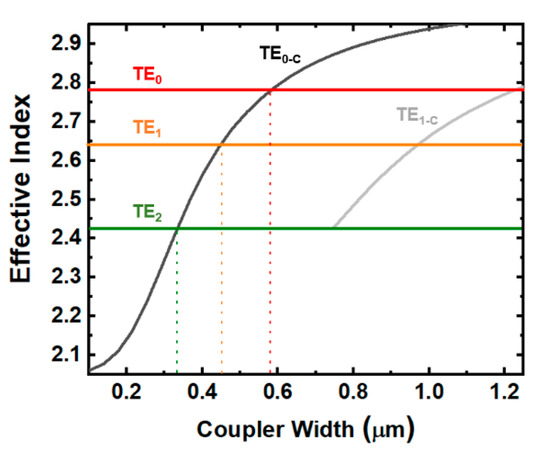 Effective index matching. Black curve is the TE0 mode in the coupler waveguide (denoted as TE0-C) and the light gray one is the TE1-C mode. Effective indices of bus waveguide (bus width of 1.4 µm, rib waveguide with shallow etch of 110 nm) are shown by the horizontal lines; the red line is TE0 mode with n = 2.78; the orange is TE1 mode with n = 2.64; and the green is TE2 mode with n = 2.42. The vertical lines highlight the effective-index-matched coupler widths (0.58 μm, 0.45 μm, and 0.33 μm for the TE0, TE1, and TE2 modes, respectively).