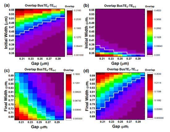 Mode overlap integral results of the initial and final widths of the tapered waveguide for the TE0 mode coupler. (a) Overlap integral between the TE0 mode of the bus waveguide and the TE0 mode of the coupler waveguide for the initial width of the tapered coupler. (b) Overlap integral between the TE2 mode of the bus waveguide and the TE0 mode of the coupler waveguide for the initial width of the tapered coupler. (c) Overlap integral between the TE0 mode of the bus waveguide and the TE0 mode of the coupler waveguide for the final width of the tapered coupler. (d) Overlap integral between the TE1 mode of the bus waveguide and the TE1 mode of the coupler waveguide for the final width of the tapered coupler. The white lines show the boundaries of overlap integrals of 0.05.