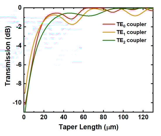 Crosstalks of the mode-selective adiabatic couplers over a wavelength range of 75 nm (1515–1590 nm) are shown in Figure 9. For the TE0 mode coupler, prominent crosstalk was the TE2 mode crosstalk, which was below −40 dB. TE0 mode crosstalk of the TE2 mode coupler was less than −50 dB. TE1 mode crosstalks of the TE0 and TE2 mode couplers were negligible (below −200 dB) owing to spatial mode mismatch between odd and even symmetries, hence, they were not presented in the figure. For the TE1 mode coupler, TE0 mode crosstalk TE2 mode crosstalk were calculated to be below −20 dB and −30 dB, respectively.