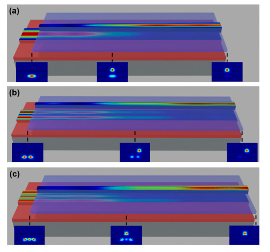 The E-field intensity profile in propagation direction (formed by superimposing the profile on the 3D perspective structures). (a) For TE0 mode coupler, the insets are in cross section views at coupler’s initial width of 0.45 µm, at effective-index-matched coupler width of 0.58 µm, and at coupler’s final width of 0.77 µm, respectively; (b) for TE1 mode coupler, the insets are in cross section views at coupler’s initial width of 0.40 µm, at effective-index-matched coupler width of 0.45 µm, and at coupler’s final width of 0.50 µm, respectively; and (c) for TE2 mode coupler, the insets are in cross section views at coupler’s initial width of 0.31 µm, at effective-index-matched coupler width of 0.33 µm, and at coupler’s final width of 0.36 µm, respectively.