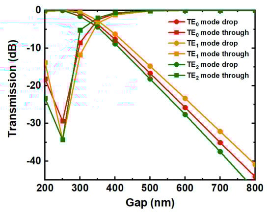 The simulated drop and through transmissions versus vertical gap spacings between the bus and coupler waveguides at 1550 nm wavelength is presented in Figure 7. The optimum gap for the coupling and the extinction was 250 nm with a fabrication tolerance of ±20 nm. Figure 8 shows spectral responses of the three mode-selective adiabatic couplers for various gap spacings. At the optimum gap spacing of 250 nm (ON state), the ILs for TE0 mode coupler, TE1 mode coupler, and TE2 mode coupler were 0.08 dB, 0.19 dB and 0.03 over the bandwidth of 75 nm from 1515 nm to 1590 nm, respectively. If the gap spacing were larger than 800 nm, there would be almost no coupling (below −40 dB). The extinction ratios (ERs) of drop/through at the optimum gap of 250 nm were better than 15 dB over the bandwidth. These values with the designed dimensions are summarized in Table 1.