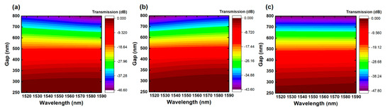 Spectral responses of the coupling for various gap spacings for (a) TE0 mode coupler, (b) TE1 mode coupler, and (c) TE2 mode coupler.