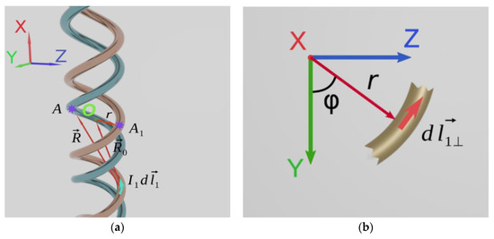 (a) relative position of the current element in the first helix and point A of the second helix, shifted along X axis; (b) the projection of a turn fragment of the first helix on the YOZ plane, perpendicular to the helix axis.