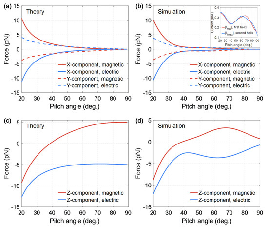 (a) Theoretic results for X- and Y-components of the forces acting on the element of the other helix and induced by electric and magnetic fields created by the entire first helix, vs. pitch angle. (b) Simulation results for X- and Y-components of the forces. (c) Theoretic results for Z-components of elementary forces vs. pitch angle. (d) Simulation results for Z-components of the forces.