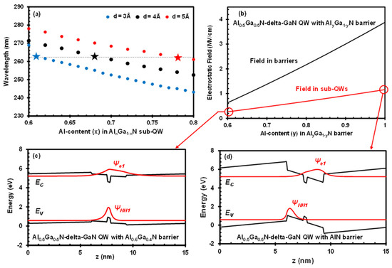 In addition to the Al content in the sub-QW, the physics of the AlGaN-delta-GaN QW structures with different Al contents (y) in the AlyGa1−yN barrier were also investigated in this study. As y increases from 0.6 to 1, the magnitudes of the electrostatic fields in both the barriers and sub-QWs increase, as shown in Figure 2b, which leads to severe band bending in structures with high Al-content AlGaN barriers. Figure 2c,d compare the band structures and wave function positions of Al0.5Ga0.5N-delta-GaN QW structures with Al0.6Ga0.4N and AlN barriers, respectively. The large electrostatic field in the structure with an AlN barrier causes heavy band bending, which exacerbates the QCSE and reduces the electron–hole wavefunction overlap, leading to a degradation in the optical properties and efficiency of this design. On the other hand, for the Al0.6Ga0.4N barrier structure, band bending is significantly reduced, increasing the wavefunction overlap significantly.