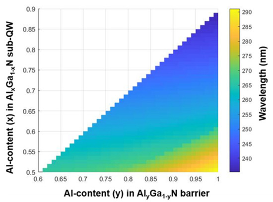 As introduced previously, promising results such as extremely high 85% have been achieved from MBE-grown Al0.9Ga0.1N-delta-GaN structures with 5 Å delta-GaN layer thickness at ~255 nm. However, in order for AlGaN-delta-GaN QW structures to be suitable for widespread implementation in DUV LEDs, their emission wavelength should be easily adjustable through THE alteration of the Al content in the AlxGa1−xN sub-QW and AlyGa1−yN barrier regions without sacrificing their characteristic high efficiencies. This work extends our study of the physics of AlGaN-delta-GaN QWs to structures with different sub-QW and barrier designs. For example, by reducing the Al content (x) in the AlxGa1−xN sub-QW, the emission wavelength redshifts due to a reduction in the effective bandgap, which is determined by both the delta-GaN layer thickness and Al content (x) in the AlxGa1−xN sub-QW. Our previous study reported peak emission wavelengths of λ = 253.6 nm from an Al0.7Ga0.3N-delta-GaN QW structure and λ = 245.1 nm from an Al0.8Ga0.2N-delta-GaN QW. Both structures had a delta-GaN thickness of d = 3 Å. More Al contents in AlxGa1−xN sub-QW are studied here and plotted in Figure 2a. Different delta-GaN layer thicknesses (d) of 3 Å, 4 Å, and 5 Å were all considered. In general, the emission wavelength decreases as the Al content x increases due to the widening of the effective bandgap as more Al is incorporated into the sub-QW, which is consistent with the results of our previous study. Specifically, for the AlGaN-delta-GaN QW with a 5 Å delta-GaN layer, the emission wavelength can be varied from λ = 278 nm to λ = 261 nm by increasing the sub-QW Al content from 60% to 80%. Moreover, λ = 252–269 nm and λ = 243–261 nm ranges can likewise be achieved using 4 Å and 3 Å delta-GaN layers, respectively. Note that there are wavelength overlaps between the three ranges, allowing for flexibility in the design of AlGaN-delta-GaN QW structures and the targeting of precise emission wavelengths. For example, to achieve λ = 262 nm emission, one could use Al0.61Ga0.39N-delta-GaN QW with 3 Å delta-GaN, Al0.68Ga0.32N-delta-GaN QW with 4 Å delta-GaN, or Al0.78Ga0.22N-delta-GaN QW with 5 Å delta-GaN, as highlighted in Figure 2a.